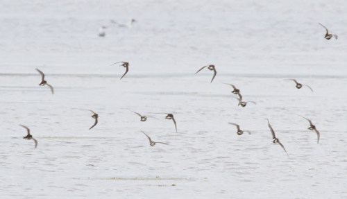 The small wader or ‘peep’ can be seen at the bottom of the flock, just left of centre. A fine black line down the white rump can be seen which is clearly wrong for a White-rumped Sandpiper. Click on the image to enlarge. Photo by John Wright.
