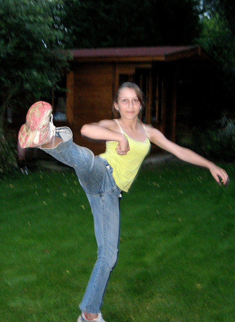 I haven’t got a photo of Kara at her Taekwondo competition but here she is demonstrating her high kicks recently on our visit to Derby.