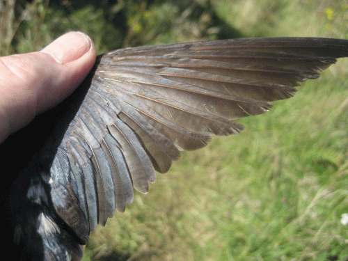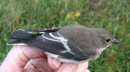 None trapped in 2011 but 13 in 2012, so far. This Pied Flycatcher can be aged as a first year by the step in the white fringe to the central tertial feather.