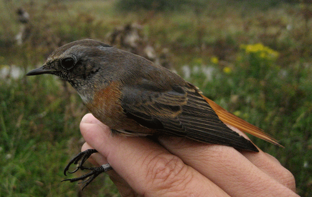 Whinchat is a regular migrant, breeding mainly in the north of the UK, but being more of a bird of open country is seldom trapped at our site at Durlston. The white base of the outer tail feathers is just visible.