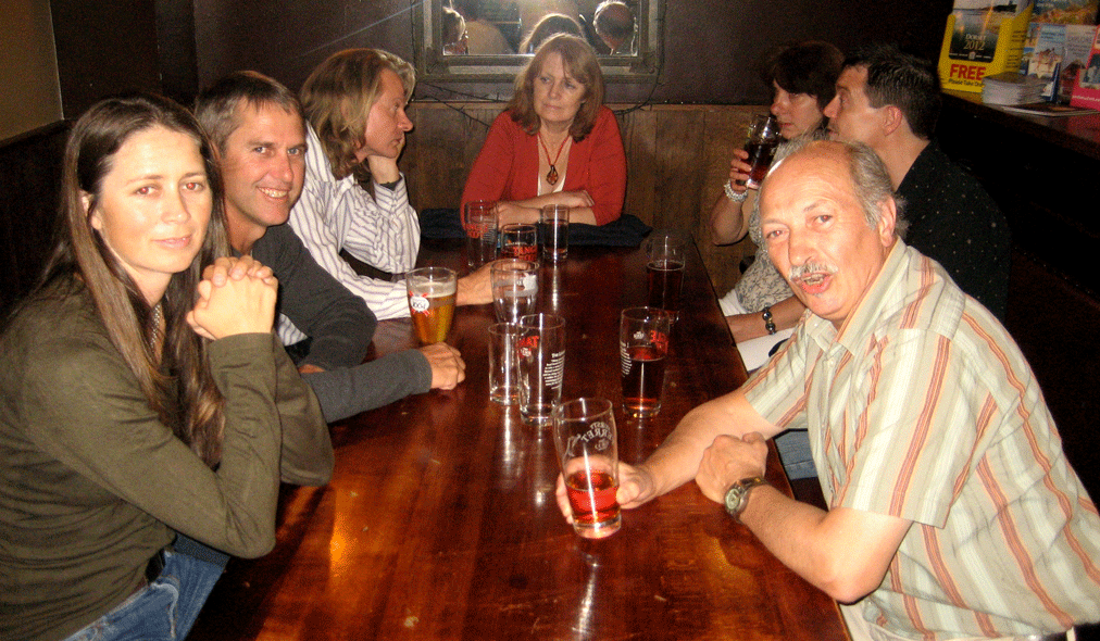 Bird pub L-R: Roger Howell, Steve F Smith, Kevin Lane, Mark Constantine, Mo Constantine, Jackie Hull.
