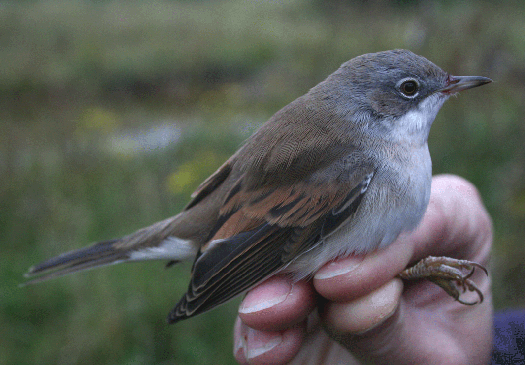 I have already mentioned the large number of young birds we have caught this year with fault bars in their tails, caused by poor nutrition during development in the nest. Less often seen are prominent fault bars in the wing as shown by this Whitethroat.