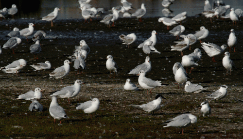 Black-headed and Mediterranean Gulls and Sandwich Terns at Lodmoor.