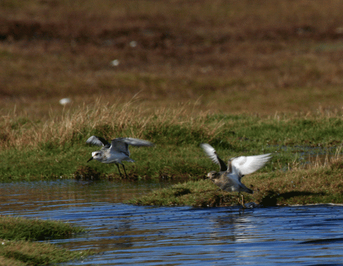 Suddenly the Sanderling and Buff-breast took flight. The startling white underwing is used in display where the wings are raised one at a time.