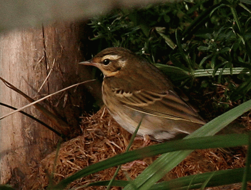 The white spot (with a black mark below it) situated behind and below the whitish supercillium is diagnostic of Olive-backed Pipit.