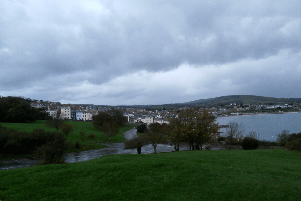 A dull and wet morning at Swanage. The Bee-eater first appeared over the trees in the foreground but spent most of its time over the houses left of centre just beyond the park.
