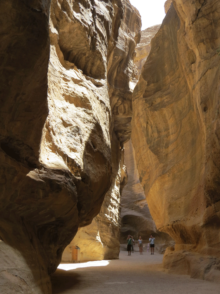 At last we see one of the most wonderful views in the world – the sunlight Treasury of Petra framed by the dark walls of the chasm.