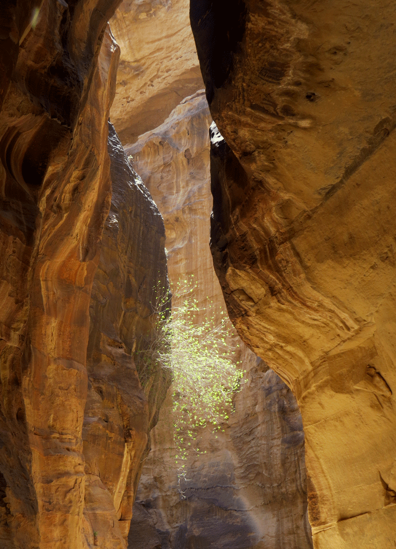 Sunlight illuminates a bush in the canyon.