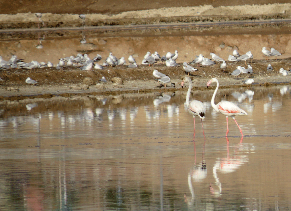 Greater Flamingos with Slender-billed Gulls in the background
