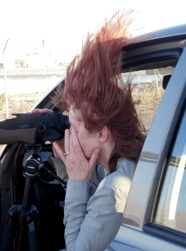Margaret struggles with the scope (and her hair) in the wind
