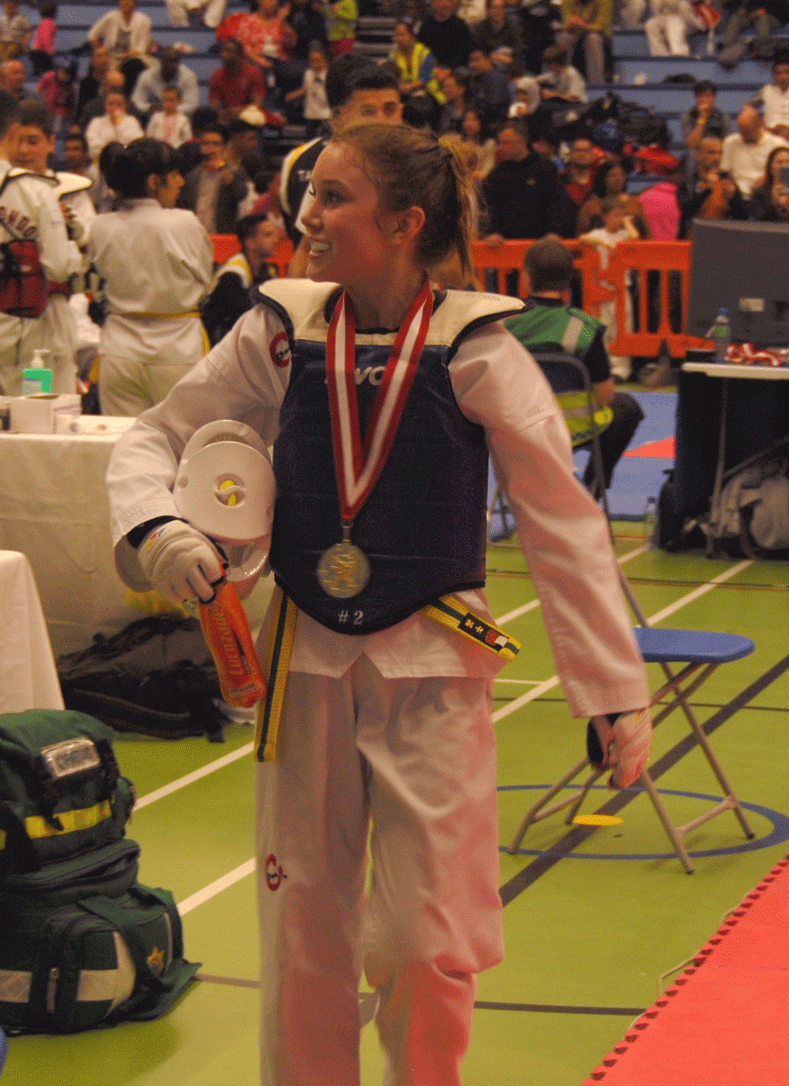 Kara (right) lands a blow on her opponent. She continues to practice Taekwondo most nights of the week. Photo by Janis Dreosti.