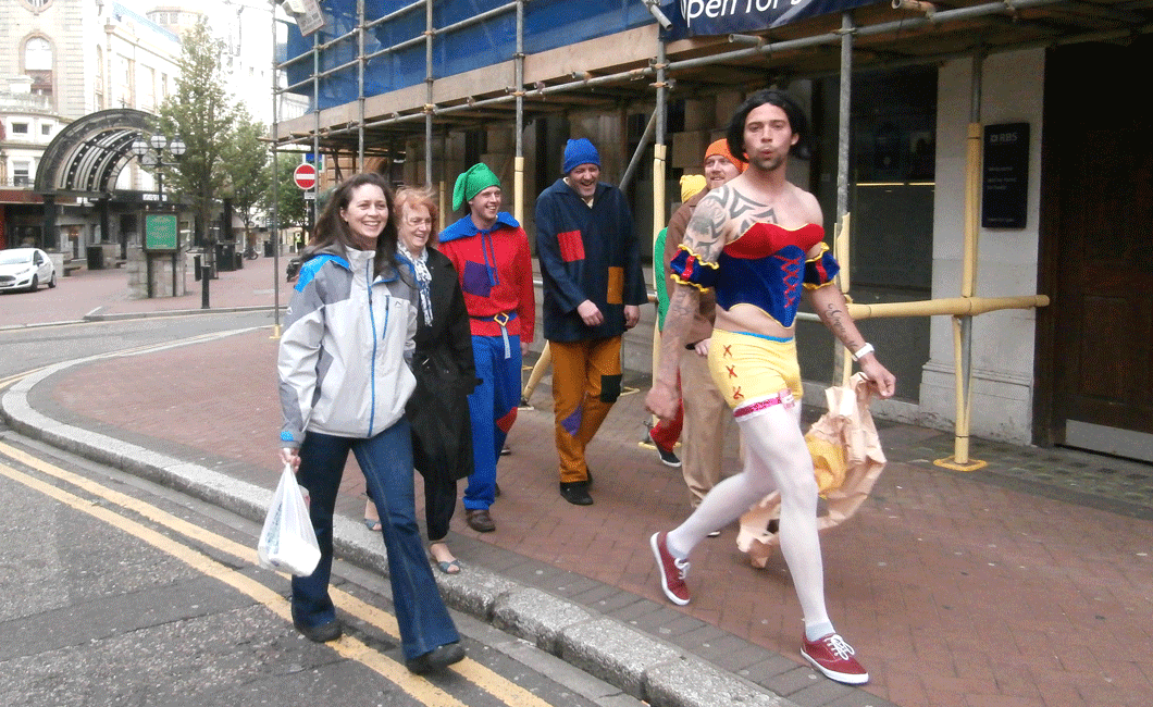 It might have been quiet but there were still some strange characters about. Here Margaret and Anita meet Snow White and the Four Dwarves in the road just outside the flat.