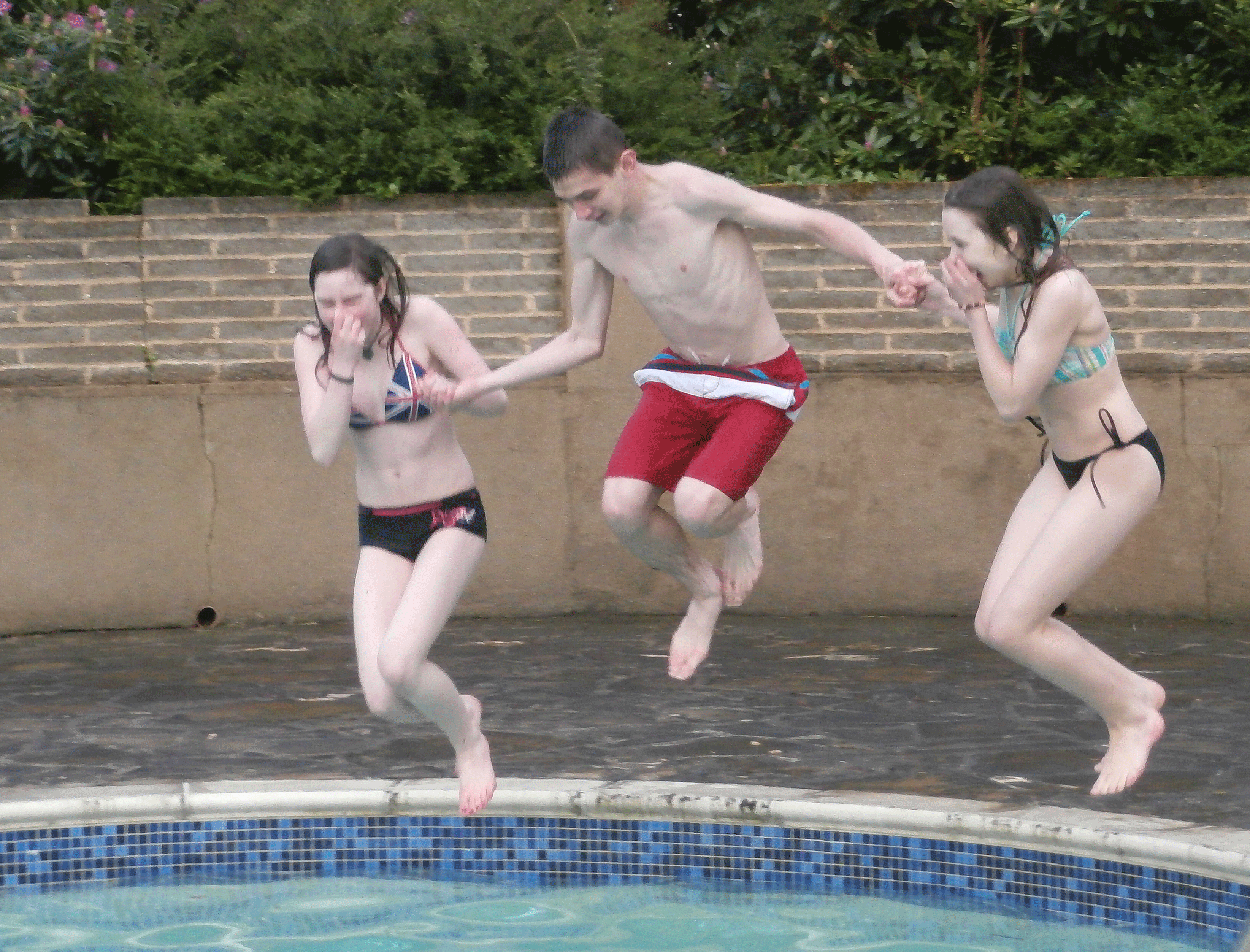 The cool and wet conditions didn’t stop Amber (L), Matt and Kara going swimming.
