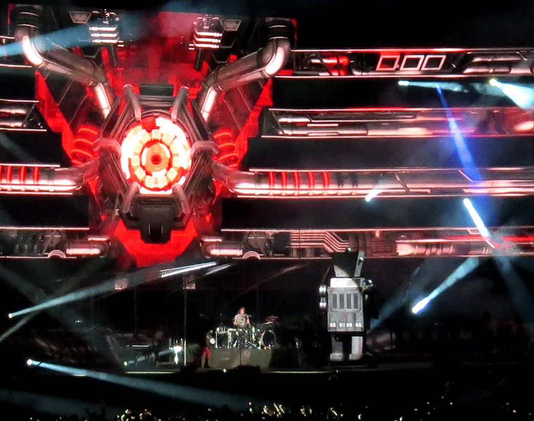 In a huge football stadium the band members look tiny (the guitarist in real life can just be seen below and right of his screen image), but images projected on giant screens allow a good view of drummer Dominic Howard and guitarist and vocalist Matthew Bellamy. The huge back drop was used for some fantastic visual effects.