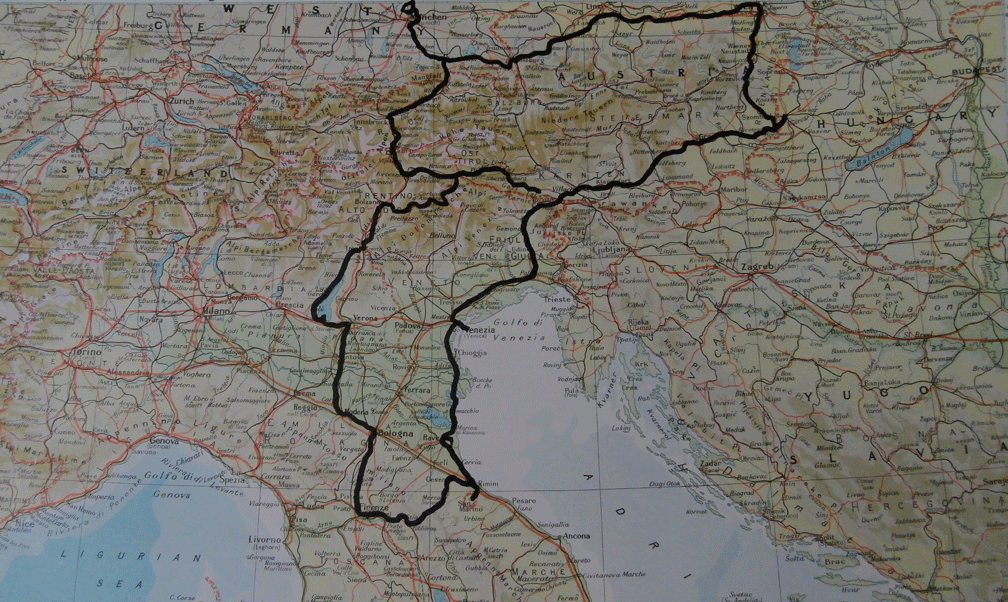 From Munich we drove south through the narrow ‘neck’ of Austria to Italy then back eastwards into southern Austria. From here we drove through the Dolomites to Bolzano and south to Lake Garda, Bologna, Florence, San Marino, Ravenna, the Po Delta and Venice. Then we drove to far eastern Austria to see Margaret’s sister before returning to Munich via Salzburg and Dachau.