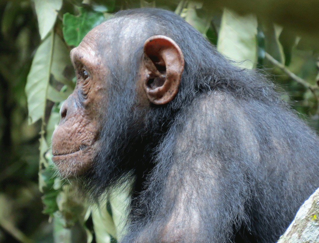 One of several adult chimps we saw in the late afternoon. apparently it is scanning the tree tops looking for a place to build a nest for the night.