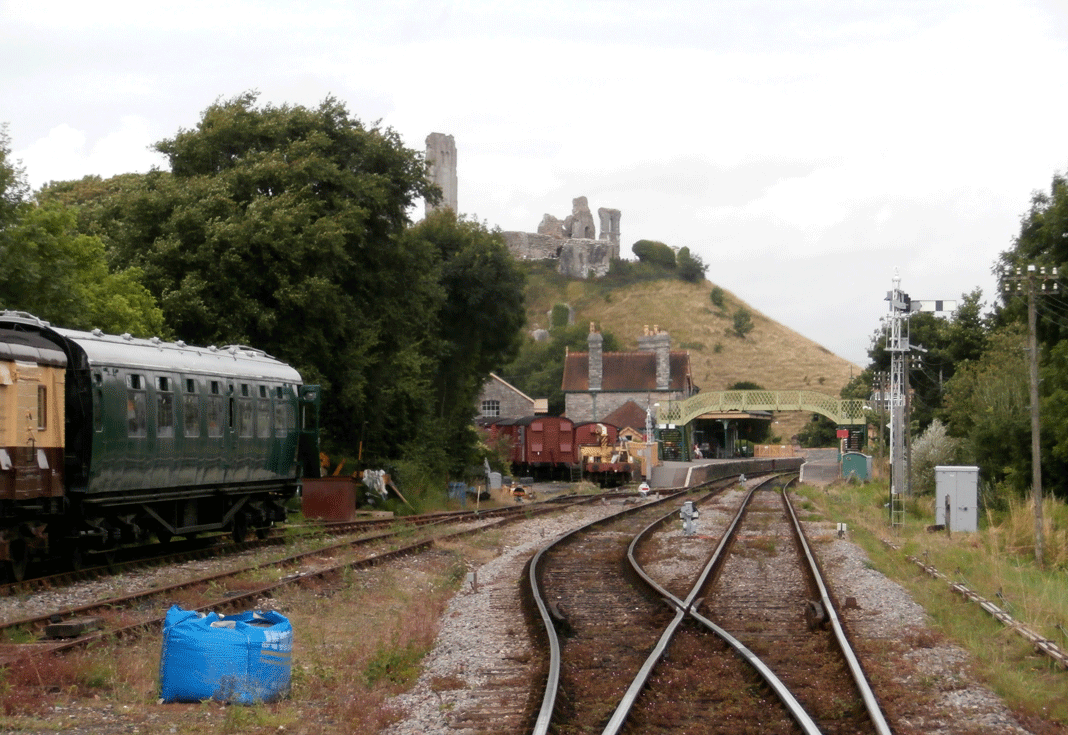 Corfe Castle is photogenic from just about every angle, we are crossing the tracks of the steam railway on our way to the Castle Inn for refreshments.