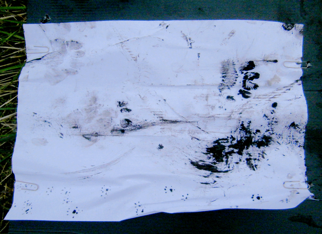 They also laid out tunnels with white paper and an ink pad to record footprints. The culprit is clearly a Badger, the black smear lower right is caused by its tail. Note some mouse footprints along the lower edge of the paper.