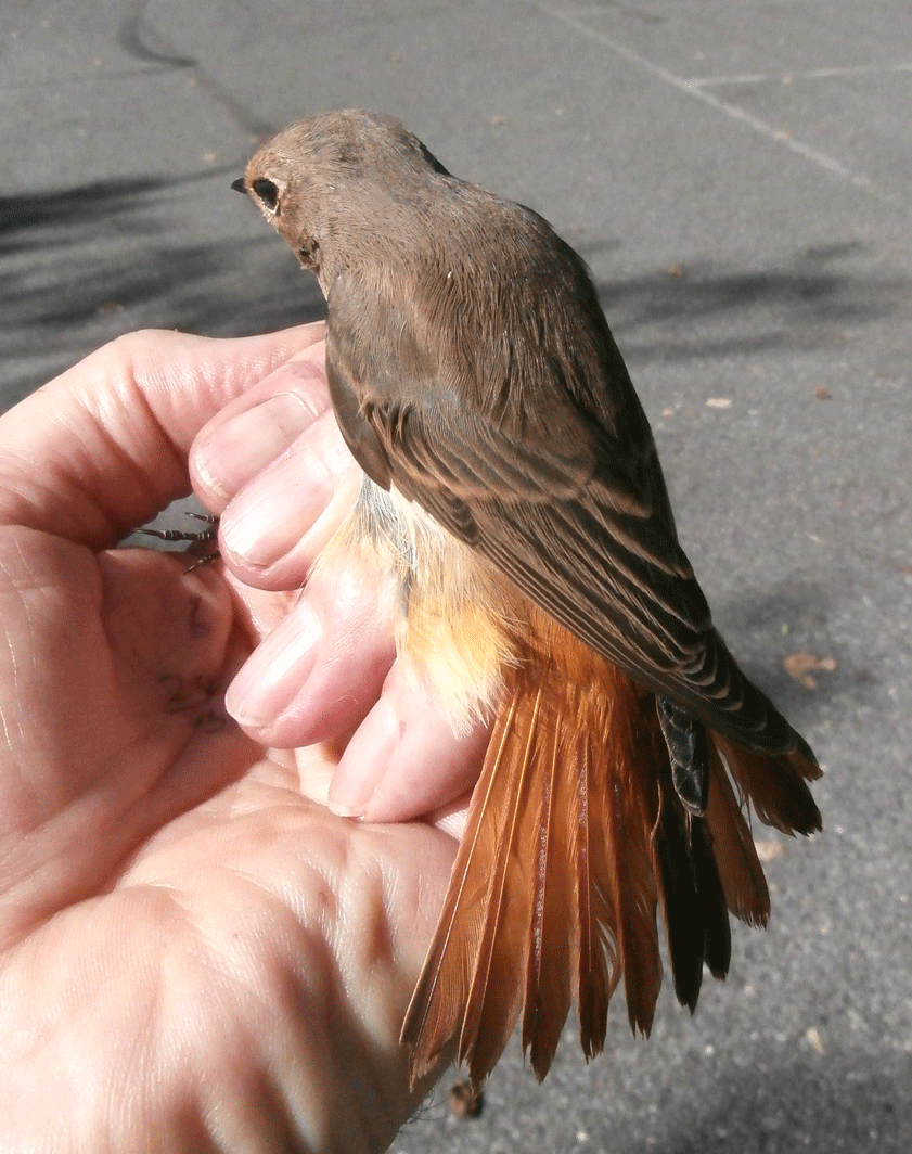 Two days later we caught her offspring. As in the adult bird above, the tail has been pressed against the ringers hand for support as if it was climbing a tree trunk.