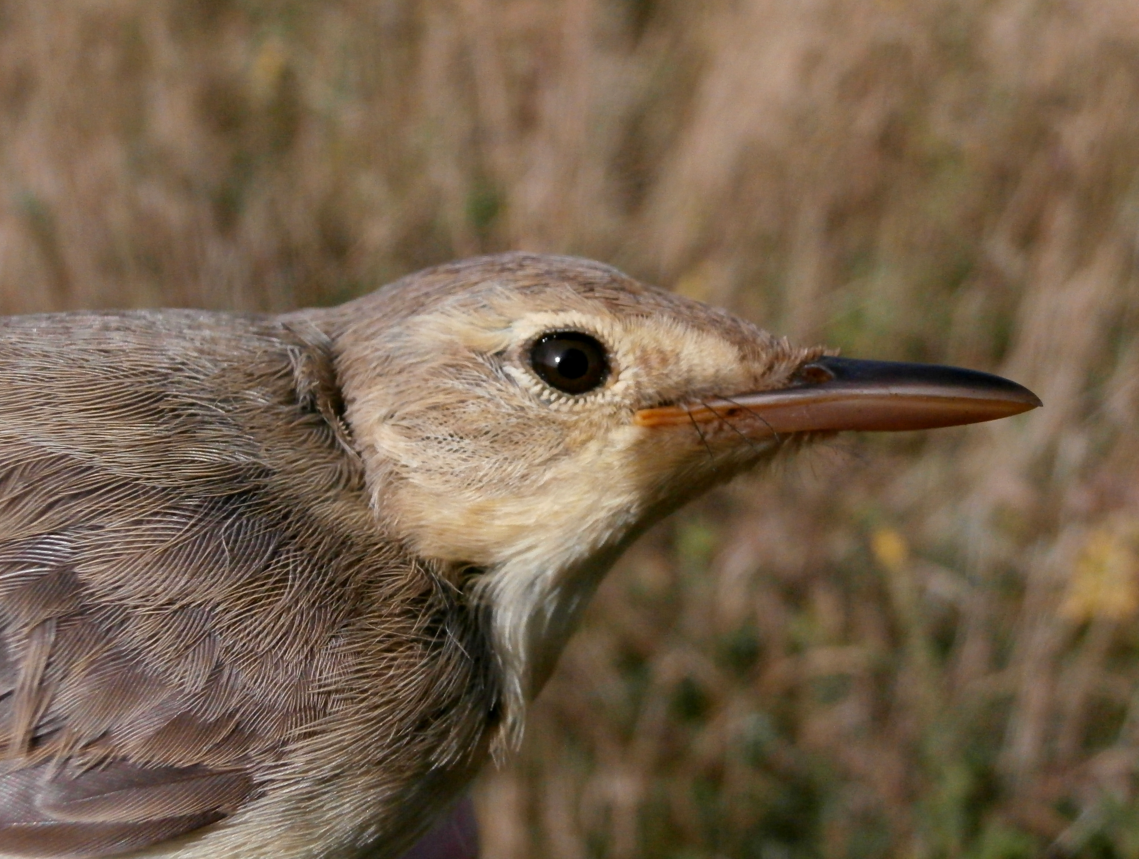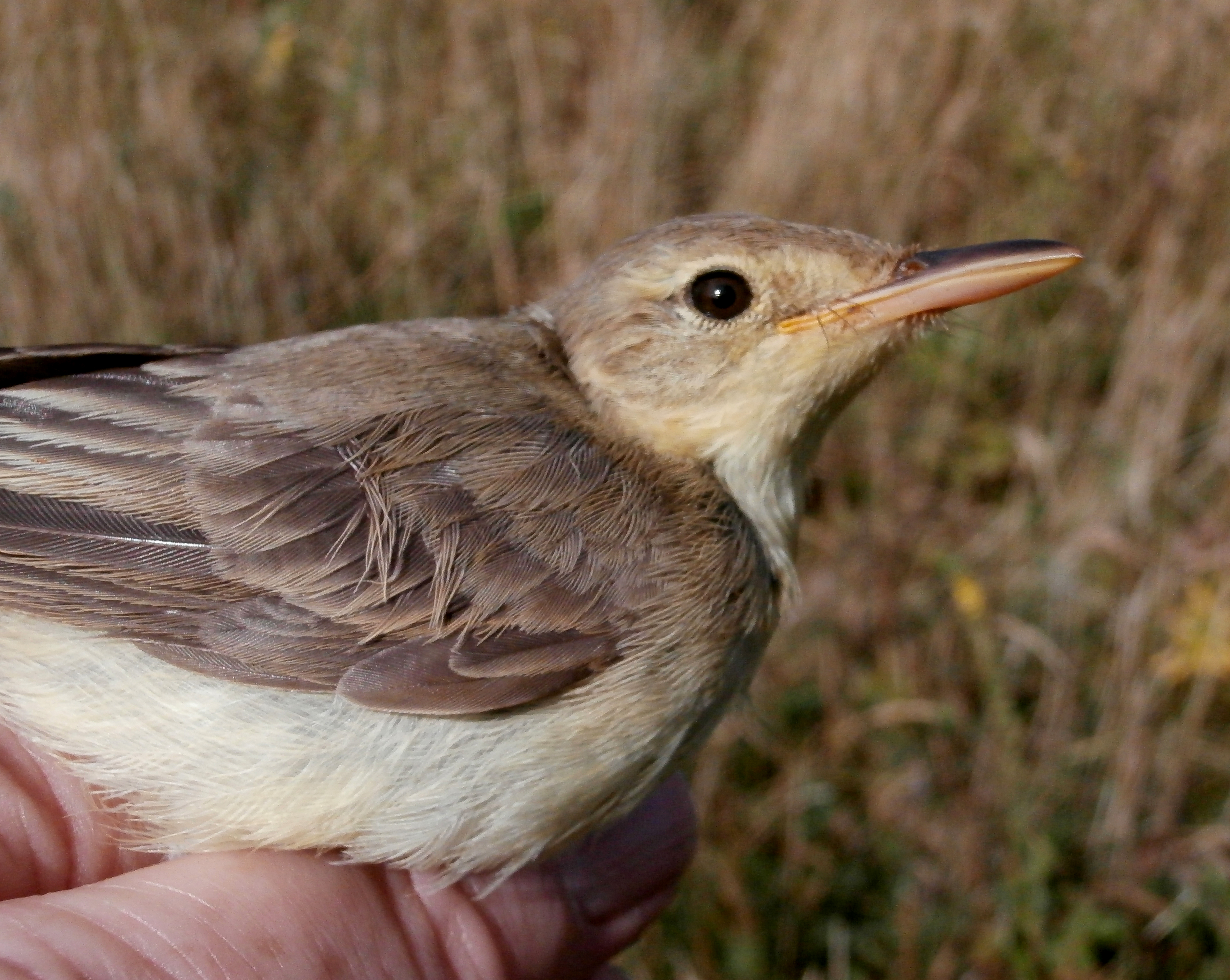 Melodious Warblers belong to the genus Hippolais, members of which have typically wide based bills, square ended tails and short undertail coverts. Melodious is best told from its closest relative, Icterine Warbler, by the short primary projection, i.e the degree to which the primaries extend beyond the exposed tertials. Compared to the Willow Warbler that was trapped at the same time, it had a similar wing length of 66mm but was a larger, stockier bird with a much heavier bill.