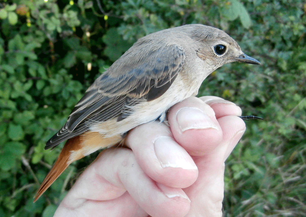 Ringing at Fleets Lane Corner has mainly involved recently fledged and moulting adult Dunnocks, Chiffchaffs and Blackcaps but a few arriving migrants have been present including Willow and Garden Warblers and most notably this first year Common Redstart.