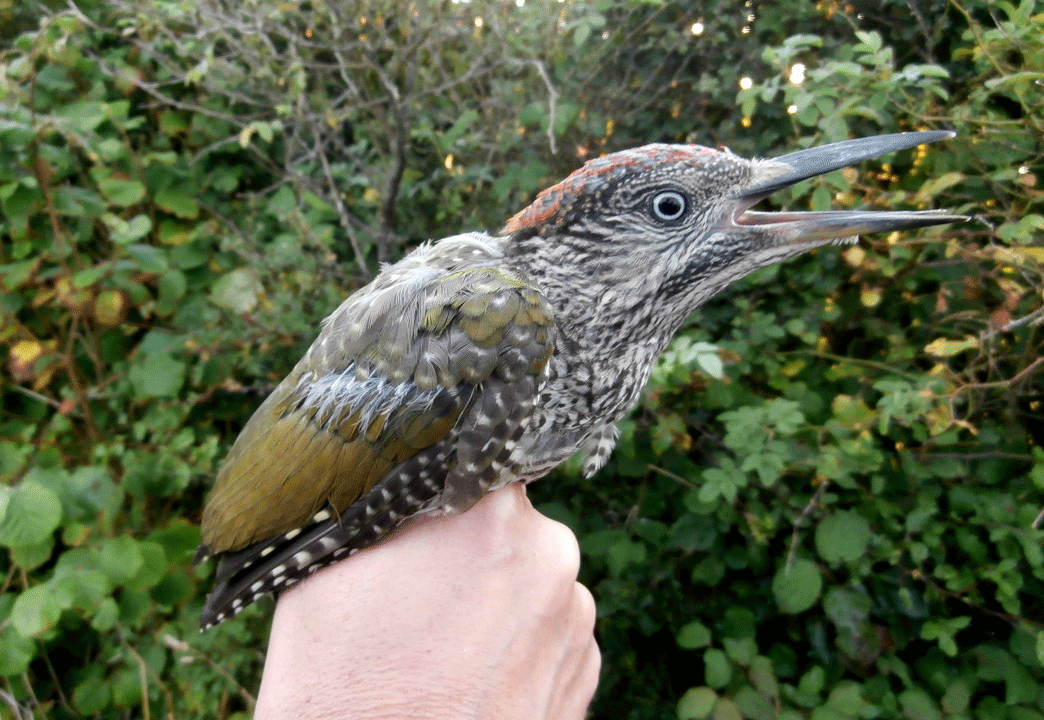 Of course ringing is all about discovering more about the population structure, life history and the movements of birds. Information on the former is obtained by statistical analysis and the results are not always immediately apparent to those in the field, however we regularly get retraps of birds we have previously ringed, for example the adult Green Woodpecker shown below was ringed in 2011 at the same site and from time to time we catch birds that others have ringed. We have have had five of these so called ‘controls’ during the last fortnight and eagerly await details of their origins. In addition we have recently been informed the BTO of a few recoveries, the best being a Cetti’s Warbler (a supposedly resident species) that moved from Lytchett to Norfolk and a Chiffchaff from Durlston to near Madrid.
