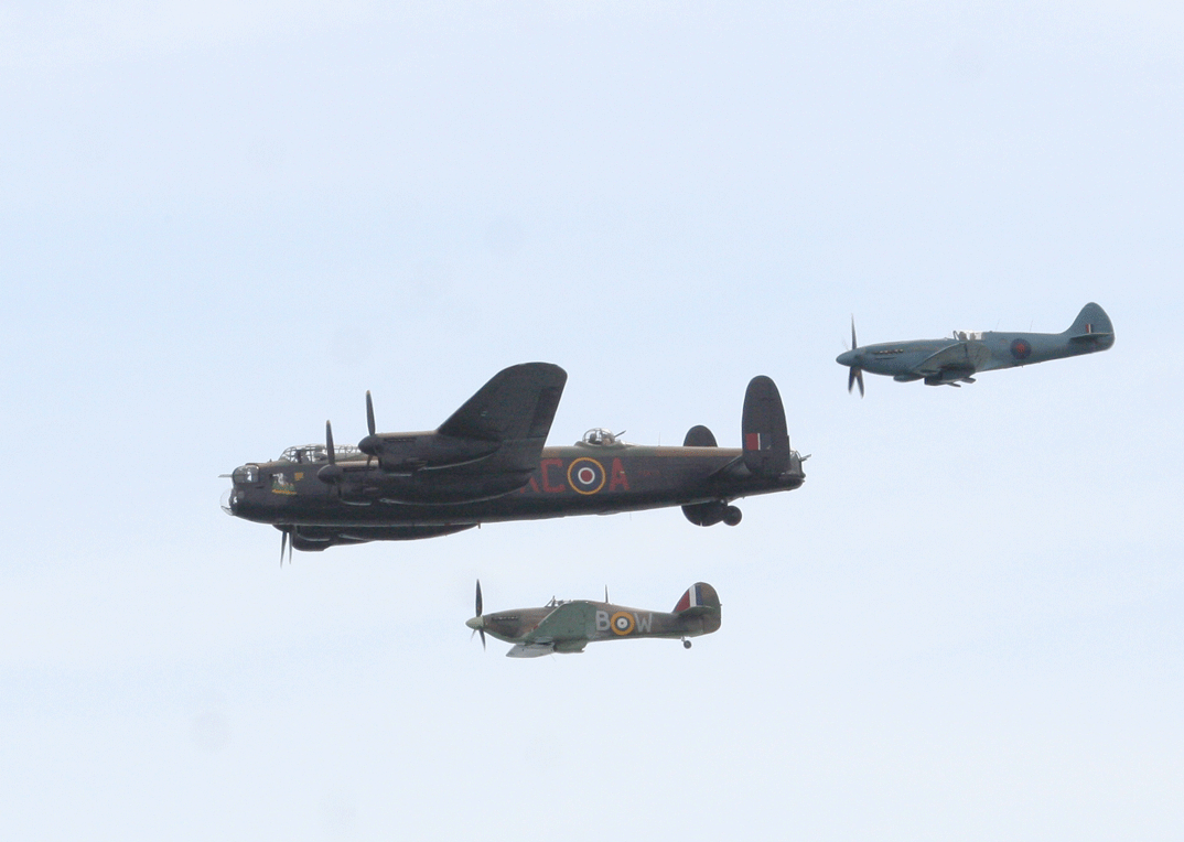 I returned on Sunday afternoon just in time to see the Battle of Britain fly past. The sight of three iconic aircraft, the Spitfire and Hurricane fighters and the Lancaster bomber in the air together was really impressive. Unfortunately the sun was now in our eyes, producing rather washed out pics.
