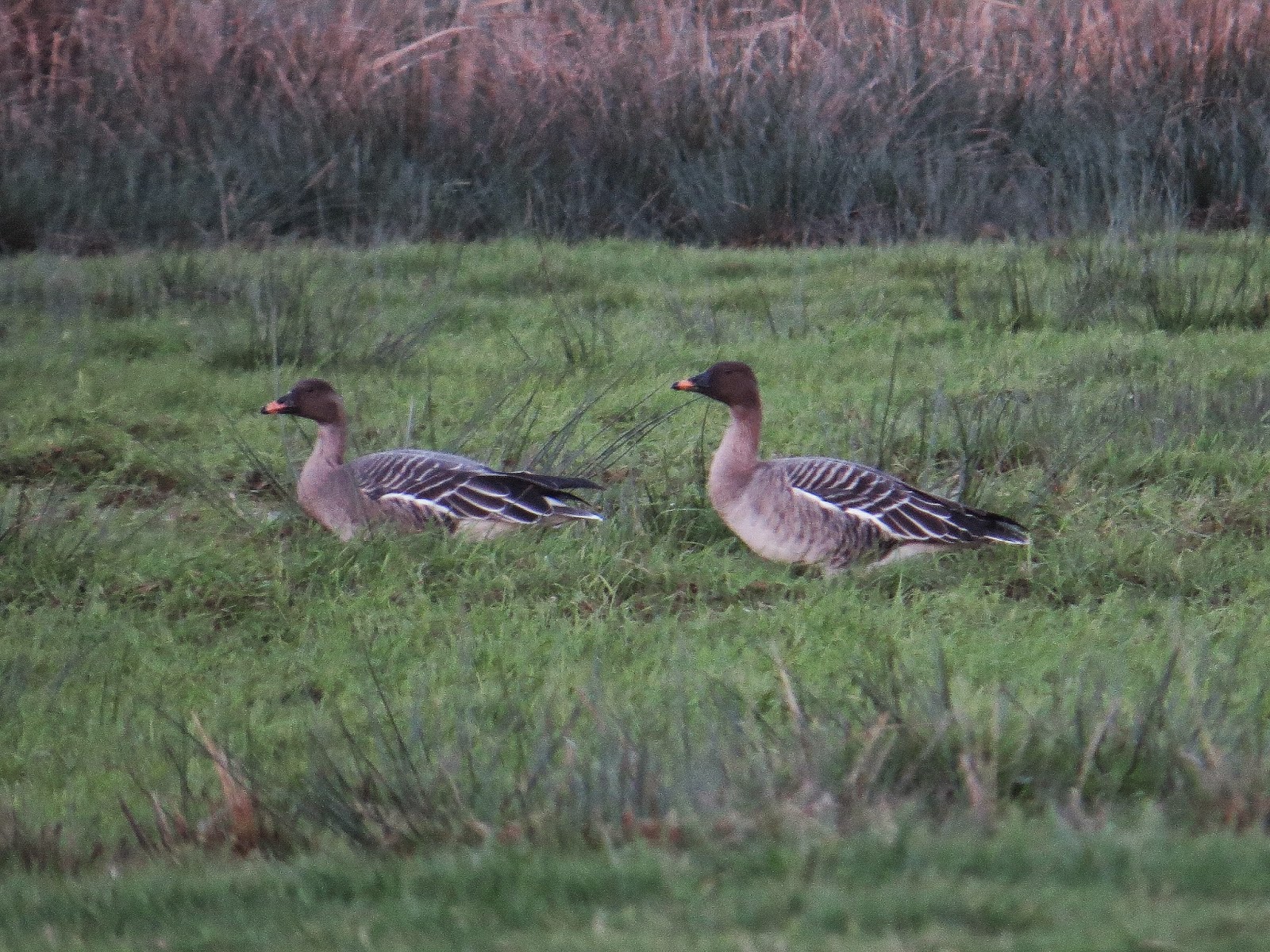 A pair of Bean Geese were found in Swineham/Aren Moors area recently. They were too far away when we saw them for photos but these shots were obtained earlier by 12 year old Joe Mitchell, published here with permission from his dad Jol. There has been debate as to whether these birds with their fairly long bills were of the taiga, rather than the expected tundra breeding race. This is of some importance as most world checklists consider then to be two different species. Expert comment however, has led me to believe that they are of the tundra group (or species) on account of the lack of a deep chest and the shape of the bill, in particular ‘grinning patch’. In a discussion a couple of years ago with my friend Paul Harvey on Shetland, I learned that many of the Bean Geese that occur in Shetland cannot be assigned to one form or the other and perhaps originate, unlike those birds that winter in Holland and the south of UK, from any area in Siberia where the two forms interbreed. Perhaps the BOU have been wise not to follow the major world checklists in splitting Bean Goose into two species.