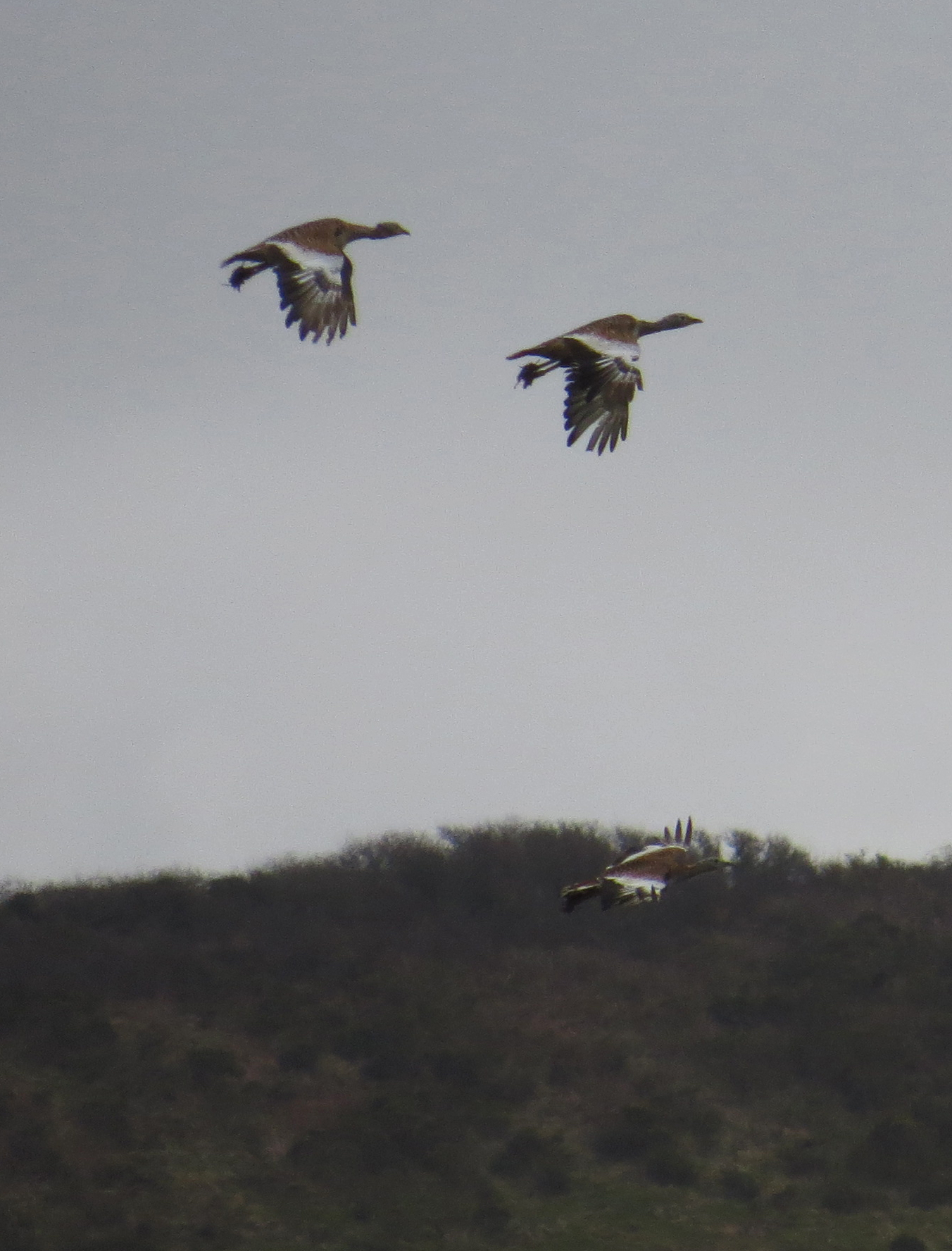 We had heard that three Great Bustards were spending the winter along the Purbeck coast. These birds are from the re-introduction program on Salisbury Plain, an ambitious and worthwhile project which is returning this magnificent bird to its former home. On arrival on the morning of the 22nd we saw the birds in the distance but after a while they took off and flew towards us…..