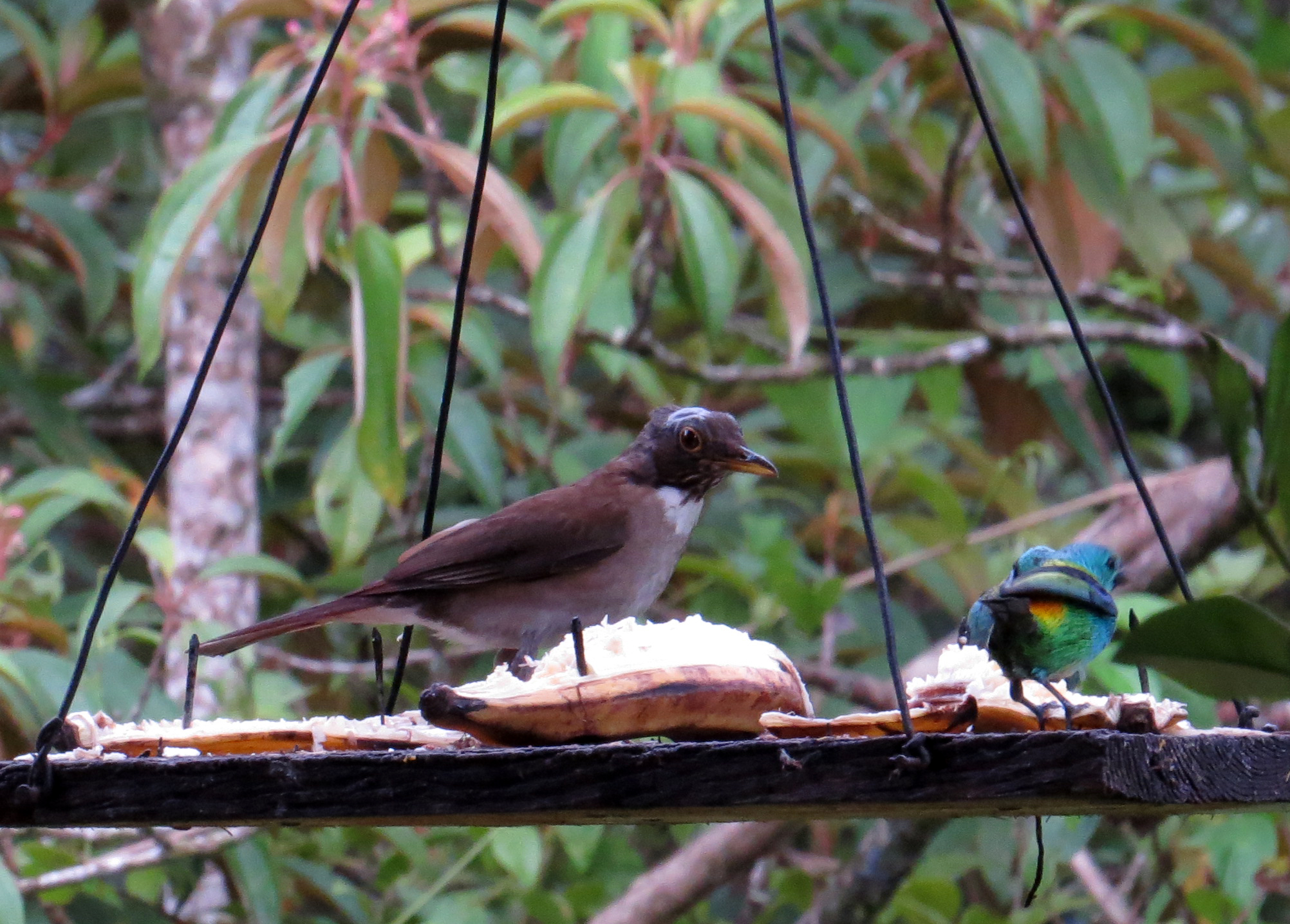 Feeders around the HQ gave some great photo opportunities – here a White-necked Thrush with two Green-headed Tanagers.