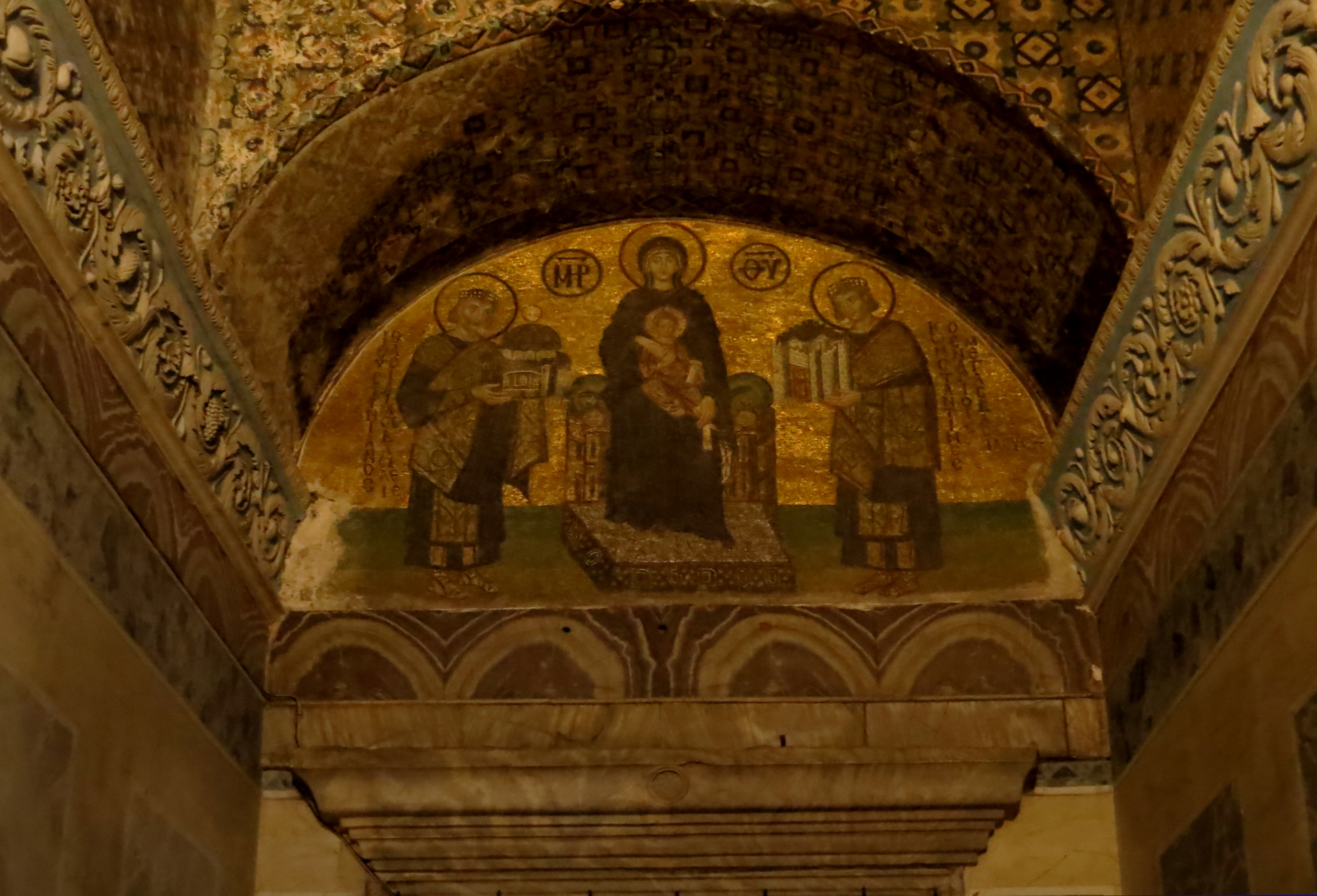 In this beautiful mosaic Mary and the Christ Child are being presented with a model of Hagia Sophia by Emperor Justinian and by a model of the city’s fortifications (then known as Constantinople) by its founder the Emperor Constantine.