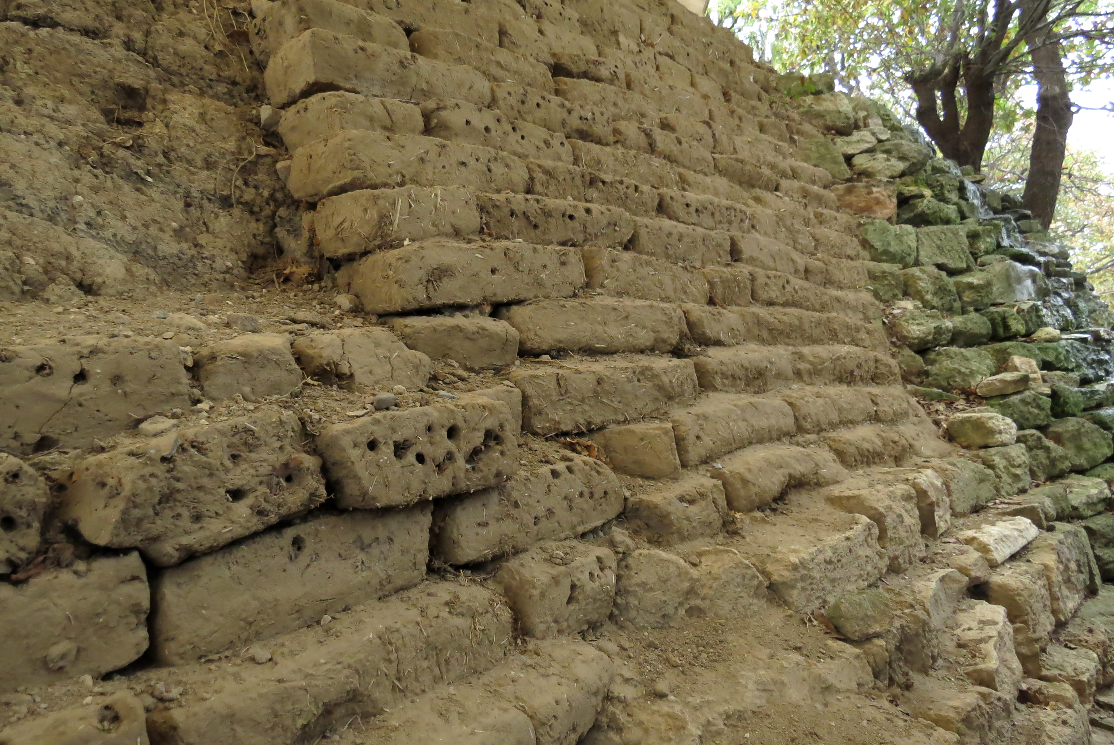 The earliest walls are not built with stone but with mud bricks and have been covered with an awning to protect them from the elements.