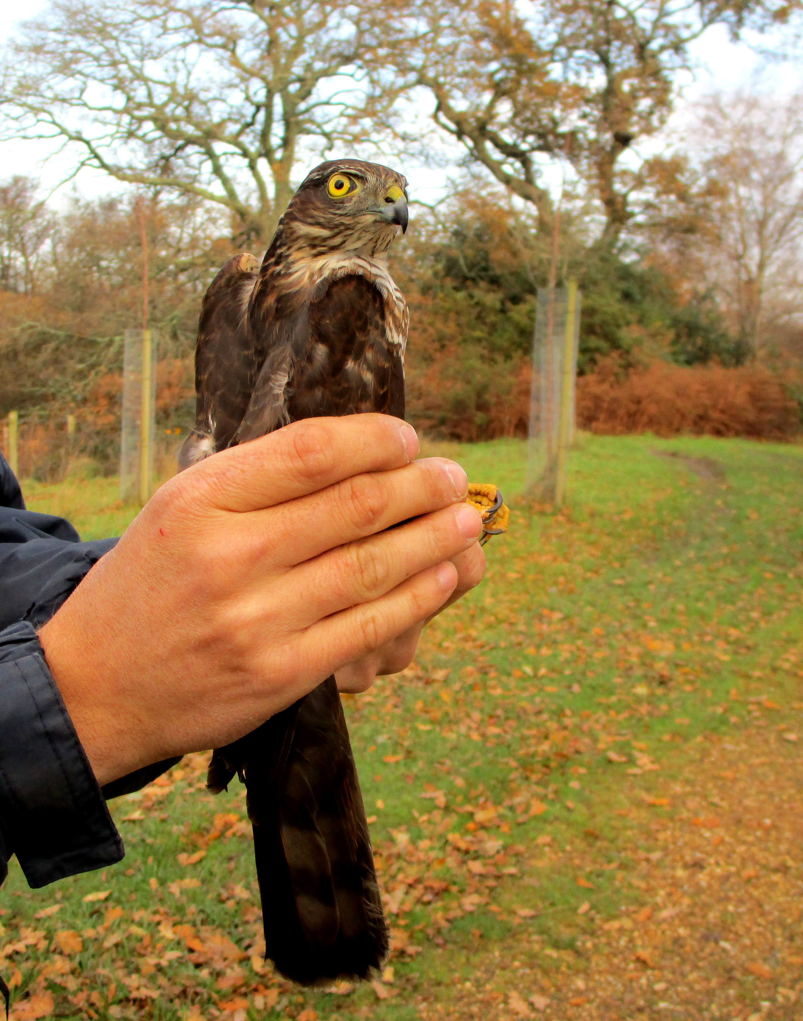 However we have taken advantage of the few lulls between the storms and have visited several of our local patches, ringing birds like this immature male Sparrowhawk ….