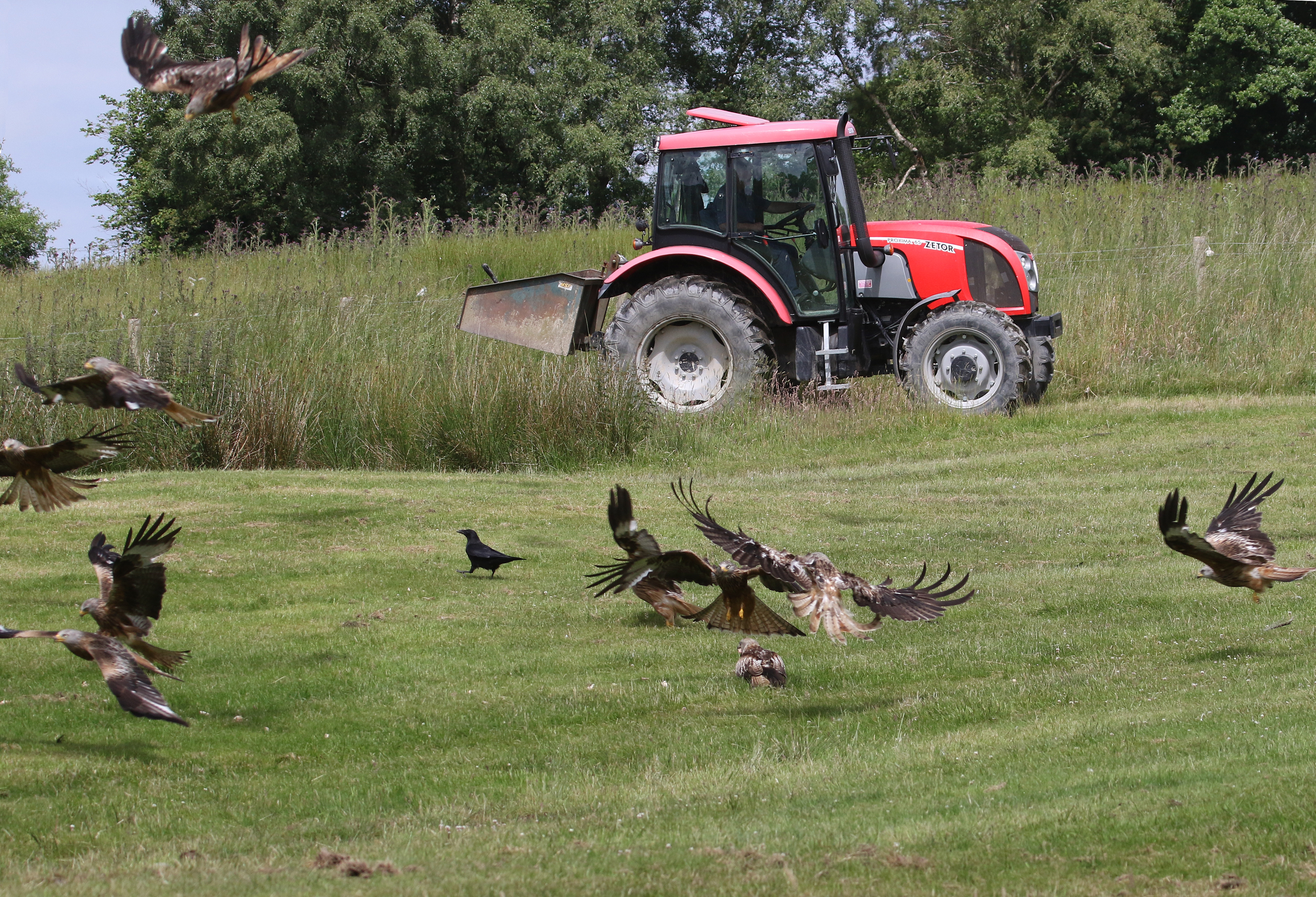 Dead on 3pm a tractor appears with the meat and the birds swoop down for their share. Visitors watch from nearby hides.