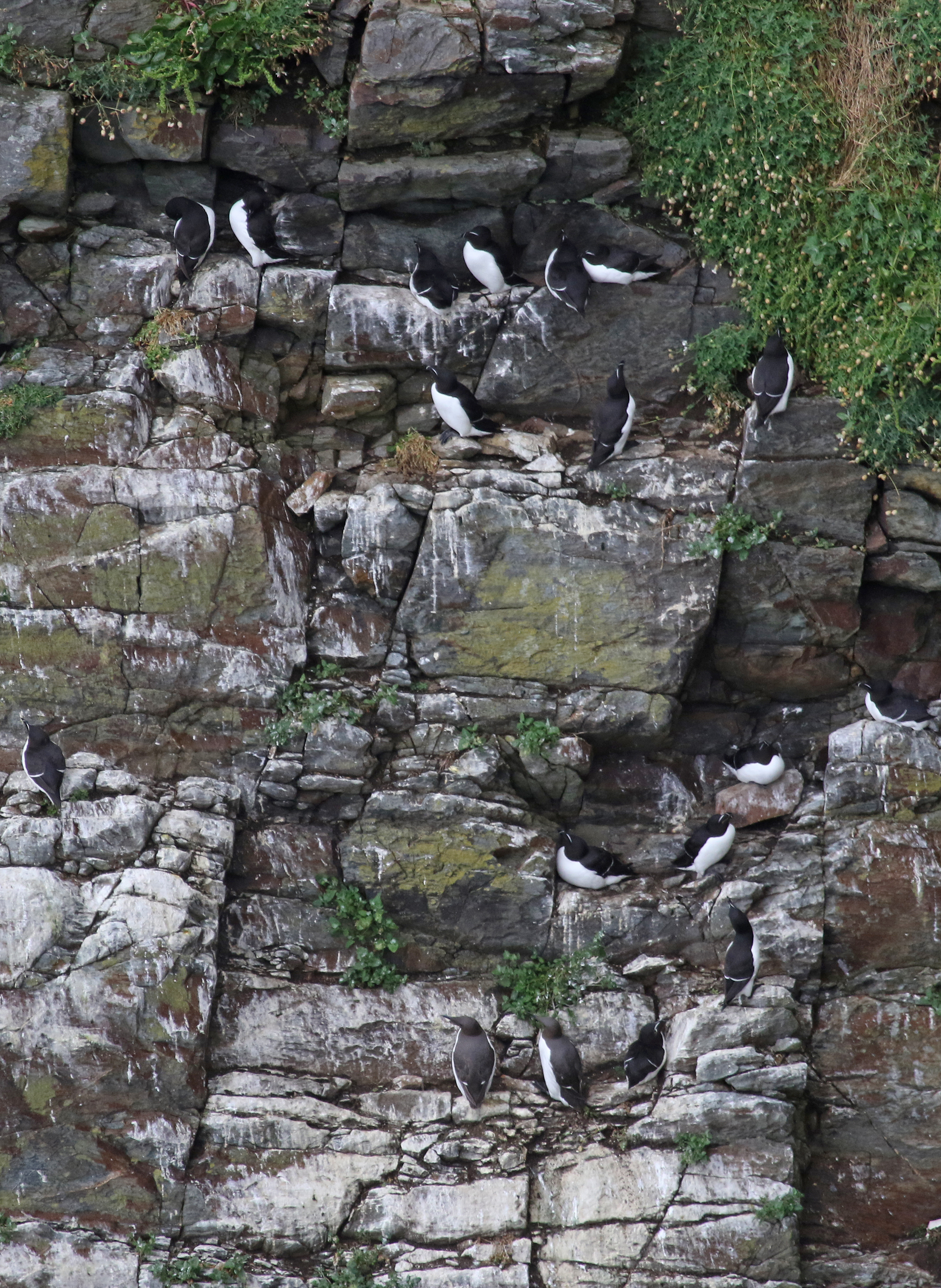 …. and smaller numbers of Razorbills (there are two Guillemots for comparison towards the bottom of this photo. We also saw a few Puffins and a couple of Choughs.