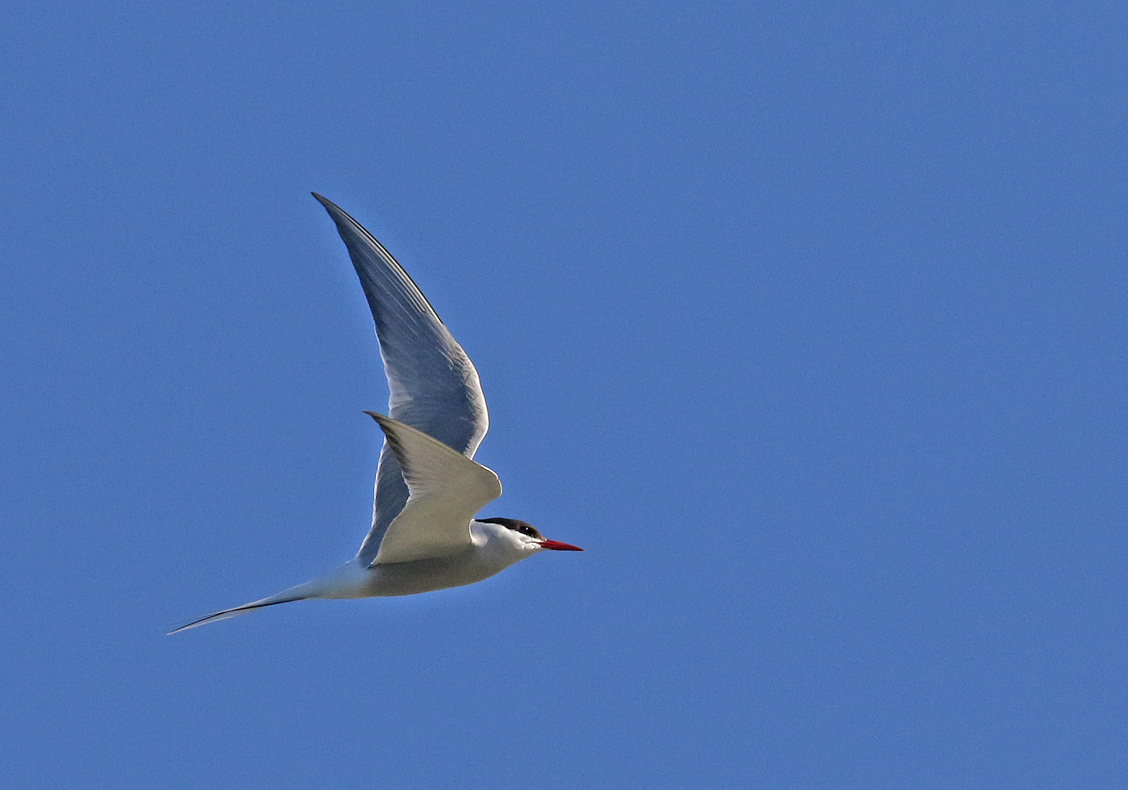 …. the longer tailed, all red-billed and greyer bellied Arctic Tern. Also note the differences in the pattern of the trailing edge to the primaries.