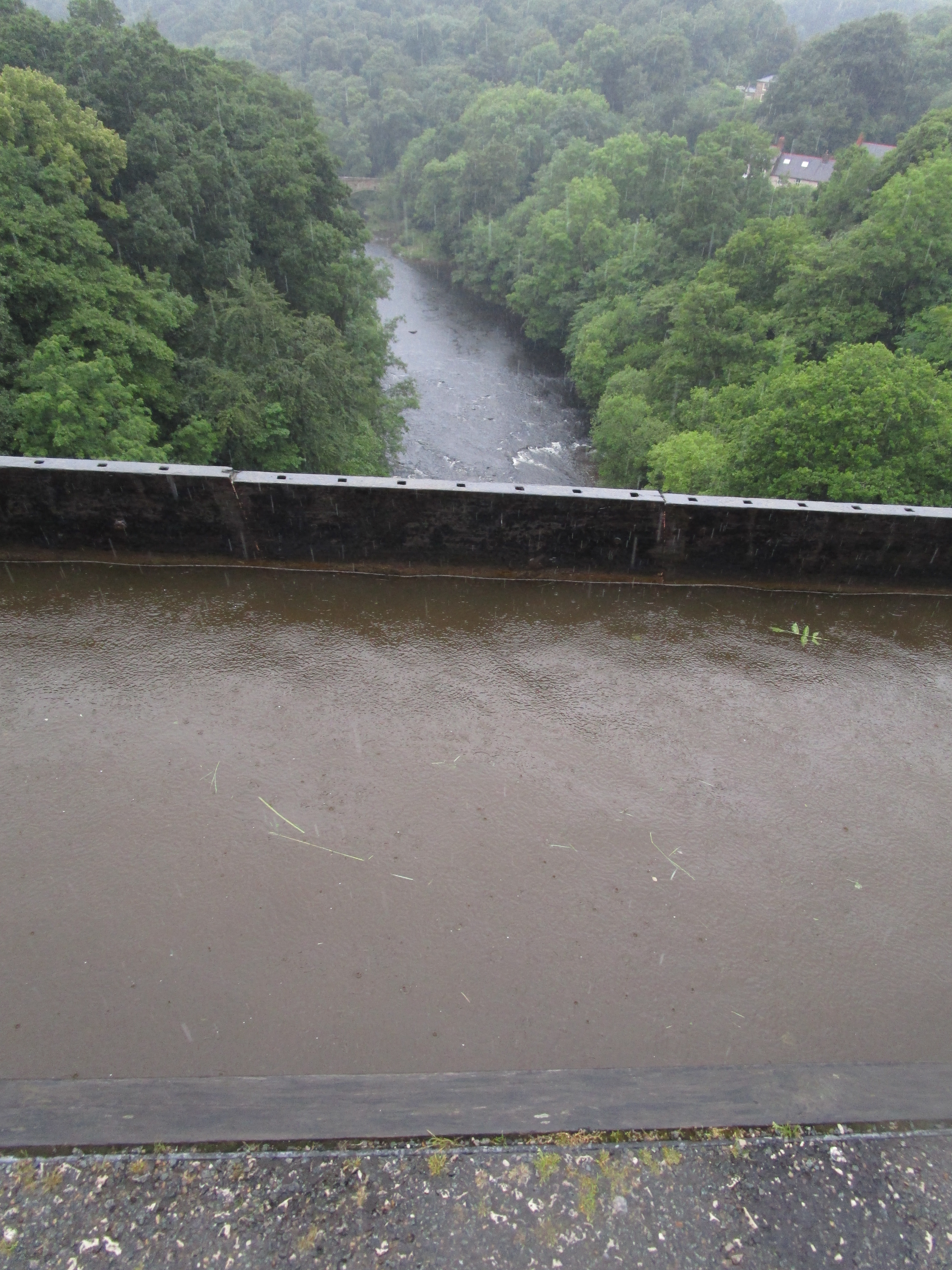 …. and the view over the unguarded western side is quite scary, not surprisingly Margaret didn’t walk far on the towpath. The now torrential rain can be seen marking the canal’s surface.
