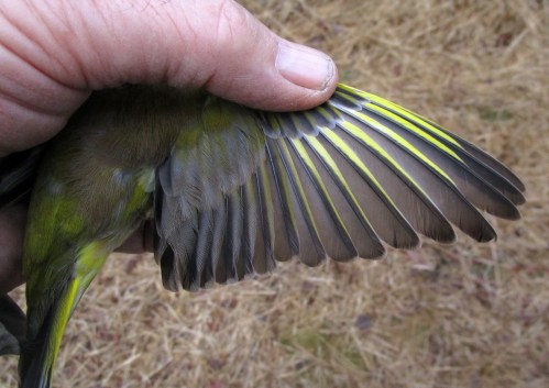 Some birds can be easily sexed in the field (for example Chaffinch or Bullfinch), other can only be reliably sexed in the hand such as this Greenfinch. The diagonal shape of the yellow on the outer webs of the inner primaries shows that this is a male. On a female the yellow would run parallel to the shaft leaving a black streak between the yellow and the shaft for the entire length of the feather.