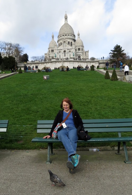 We caught the Metro to the Sacré-Cœur Basilica in Montmartre. By now we were pretty foot sore, here Margaret stops to rest her feet and admire a pigeon.
