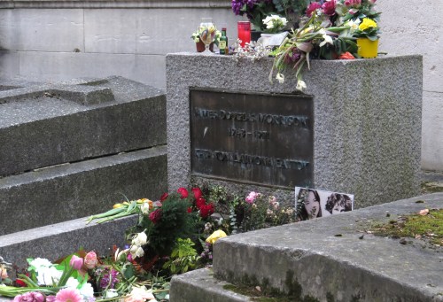 But the tomb we wanted most to see was that of rock star and poet Jim Morrison, lead singer of the Doors who died in Paris in 1971 at the age of 27. The original tomb was covered in graffiti by fans and the stone bust of the singer was stolen in 1988. The entire tomb was replaced in 1990 and fenced off from the public. The Greek inscription translates as translated as ‘faithful to his spirit’ or ‘against the devil within’.
