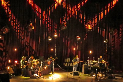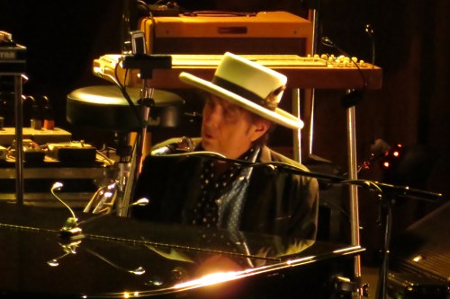 Unfortunately by the time we got tickets only one from the back of the upper terrace were available. From this distance it was hard to even make out which one was Dylan, especially as he was seated at the piano for much of the time and his features were hidden by a wide-brimmed hat. Fortunately I had brought my camera and took some (not especially sharp) telephoto shots.