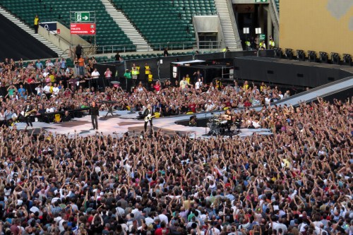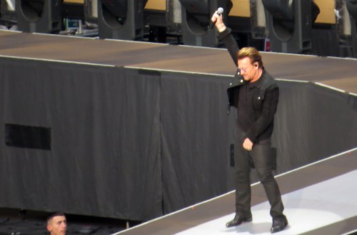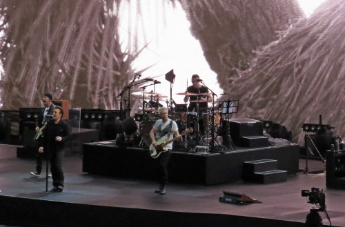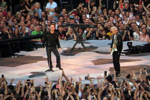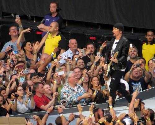 …. followed by bassist Adam Clayton and finally by Bono. The band launched into their famous 1983 hit ‘Sunday Bloody Sunday’. The band have always been at pains to state that this is not a IRA sympathiser’s song and reject the call to the republican cause with ‘But I won’t heed the battle call, it puts my back up, puts my back up against the wall’. The effect on the audience was electric, everyone was on their feet, waving arms and singing along.