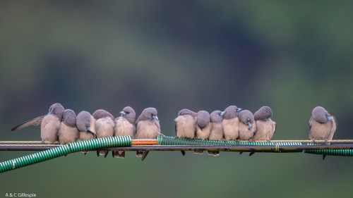 We had two evenings and a full day at Thattenkad, among the many species we saw were this roosting group of Ashy-headed Woodswallows … (Photo copyright Alec Gillespie)