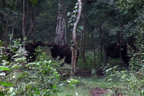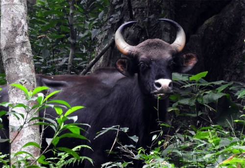 Not quite as unexpected, but still amazing to see was this small herd of Gaur or Indian Bison in the forest. Our local guides said that they were hard to see at present because they frequented the water’s edge but water levels were currently very high, forcing them back into the forest. We found them on our final morning at Periyar. This rather dull photo was taken on my pocket camera …