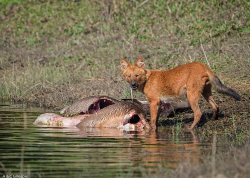 But the overwhelming surprise during our time at Periyar was seeing another pack of Dhole. To go from ‘never seen before on the South India tour’ to seeing two packs on one trip was remarkable to say the least. The pack of seven had brought down a Sambar by the water’s edge and took turns coming to the carcass and taking away mouthfuls. Unlike the previous pack near Jungle Hut (see previous post) they were relaxed in our presence and we had what is often described as ‘walk-away views’. (Photo copyright Alec Gillespie).