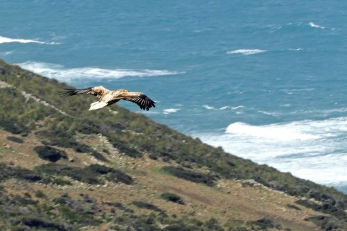 … we had noticed that a groups of five Egyptian Vultures had appeared from the east and passed up the valley on two occasions, when this happened for the third time we concluded that the same flock must be flying up the west side of the peninsular to the northernmost tip and finding the weather unsuitable for a sea crossing, returning down the east side and going round again and again.