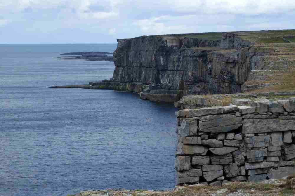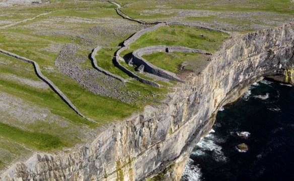 From Wkipedia: It is not known exactly when Dún Aonghasa was built, though it is now thought that most of the structures date from the Bronze Age and Iron Age. Excavations at the site indicate that the first construction goes back to 1100 BC, when the first enclosure was erected by piling rubble against large upright stones. Around 500 BC, the triple wall defences were probably built along the western side of the fort. The 19th-century artist George Petrie called Dún Aonghasa “the most magnificent barbaric monument in Europe”. Its name, meaning “Fort of Aonghas”, may refer to the pre-Christian god of the same name described in Irish mythology, or the mythical king, Aonghus mac Úmhór. The fort consists of a series of four concentric walls of dry stone construction, built on a high cliff some one hundred metres above the sea. At the time of its construction sea levels were considerably lower and a recent documentary estimates that originally it was 1000 metres from the sea. Surviving stonework is four metres wide at some points. The original shape was presumably oval or D-shaped but parts of the cliff and fort have since collapsed into the sea. Outside the third ring of walls lies a defensive system of stone slabs, known as a cheval de frise, planted in an upright position in the ground and still largely well-preserved. These ruins also feature a huge rectangular stone slab, the function of which is unknown. Impressively large among prehistoric ruins, the outermost wall of Dún Aonghasa encloses an area of approximately 6 hectares. Photo from visitgalway.ie