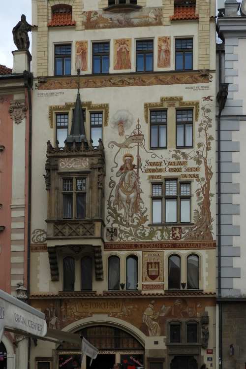 Nearby is the famous Astronomical Clock or Prague Orloj. From Wikipedia: The Orloj is mounted on the southern wall of Old Town Hall in the Old Town Square. The clock mechanism has three main components — the astronomical dial, representing the position of the Sun and Moon in the sky and displaying various astronomical details; statues of various Catholic saints stand on either side of the clock; “The Walk of the Apostles”, a clockwork hourly show of figures of the Apostles and other moving sculptures, notably a figure of a skeleton, representing Death, striking the time; and a calendar dial with medallions representing the months.