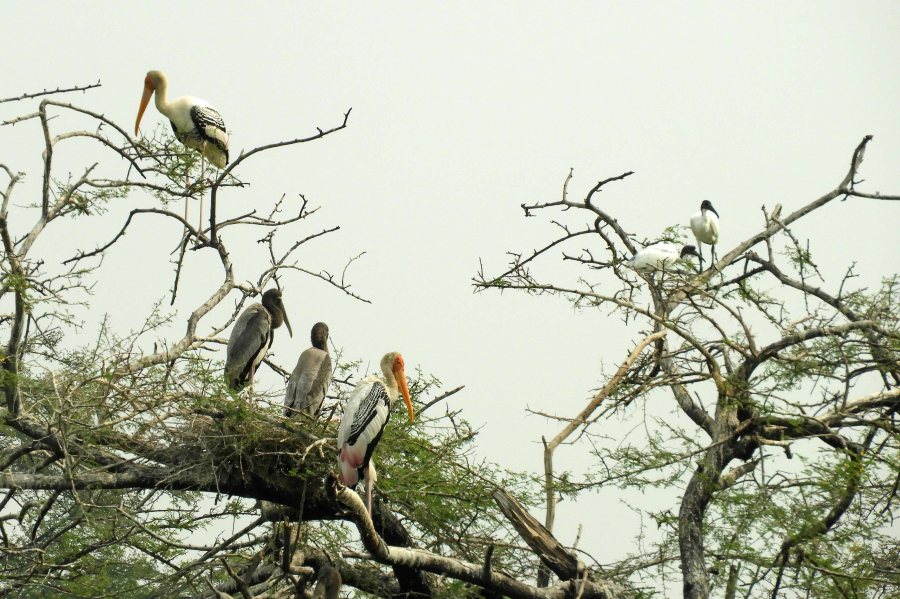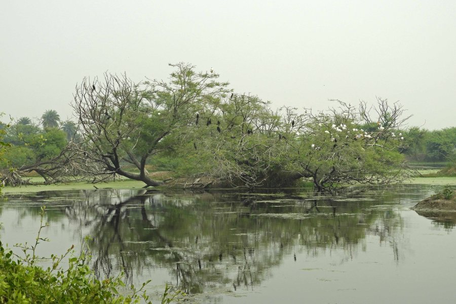 Many waterbirds breed on the jheels but at this time of year most are using the trees as roosting sites. In this photo mainly Great Cormorants, Painted Storks and Black-headed Ibis.