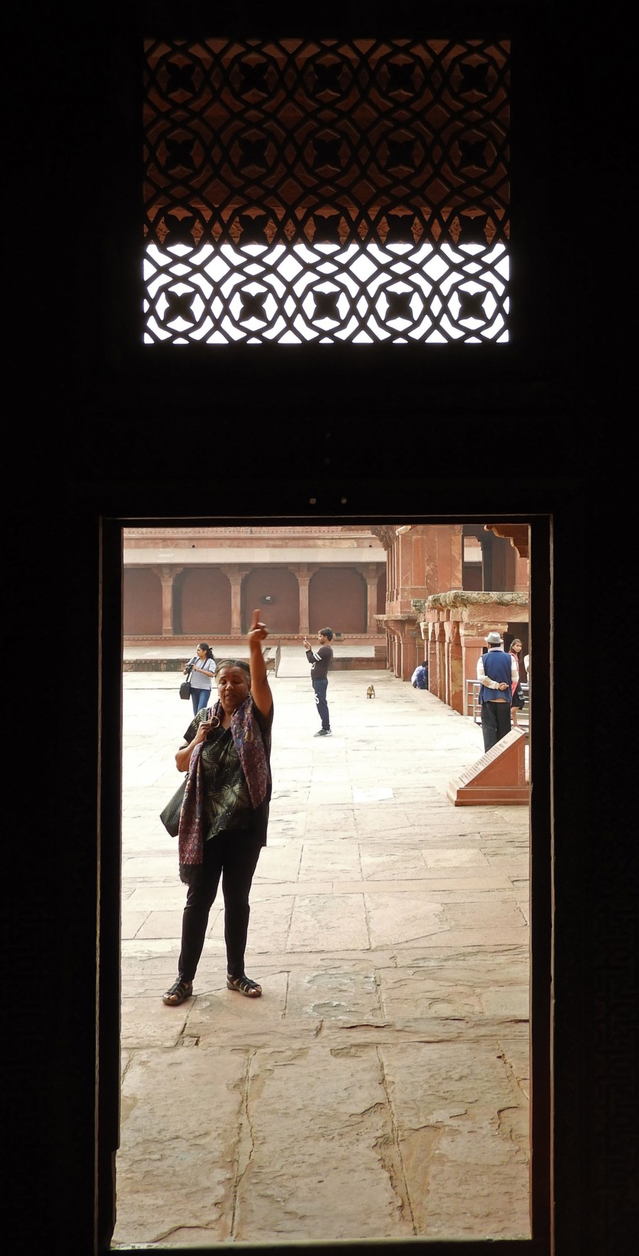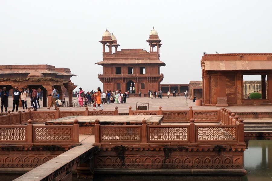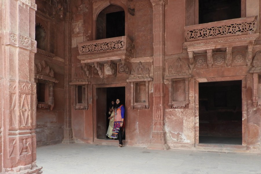 Of course we could only visit a small part of the city. More from Wikipedia: Fatehpur Sikri sits on rocky ridge, 3 kilometres in length and 1 km wide and palace city is surrounded by a 6 km wall on three sides with the fourth bordered by a lake. The city is generally organized around this 40 m high ridge, and falls roughly into the shape of a rhombus. The general layout of the ground structures, especially the “continuous and compact pattern of gardens and services and facilities” that characterized the city leads urban archaeologists to conclude that Fatehpur Sikri was built primarily to afford leisure and luxury to its famous residents. The dynastic architecture of Fatehpur Sikri was modelled on Timurid forms and styles. The city was built massively and preferably with red sandstone. Gujarati influences are also seen in its architectural vocabulary and décor of the palaces of Fatehpur Sikri. The city’s architecture reflects both the Hindu and Muslim form of domestic architecture popular in India at the time. The remarkable preservation of these original spaces allows modern archaeologists to reconstruct scenes of Mughal court life, and to better understand the hierarchy of the city’s royal and noble residents. It is accessed through gates along the 8.0 km long fort wall, namely, Delhi Gate, the Lal Gate, the Agra Gate and Birbal’s Gate, Chandanpal Gate, The Gwalior Gate, the Tehra Gate, the Chor Gate, and the Ajmeri Gate. The palace contains summer palace and winter palace for Queen Jodha.